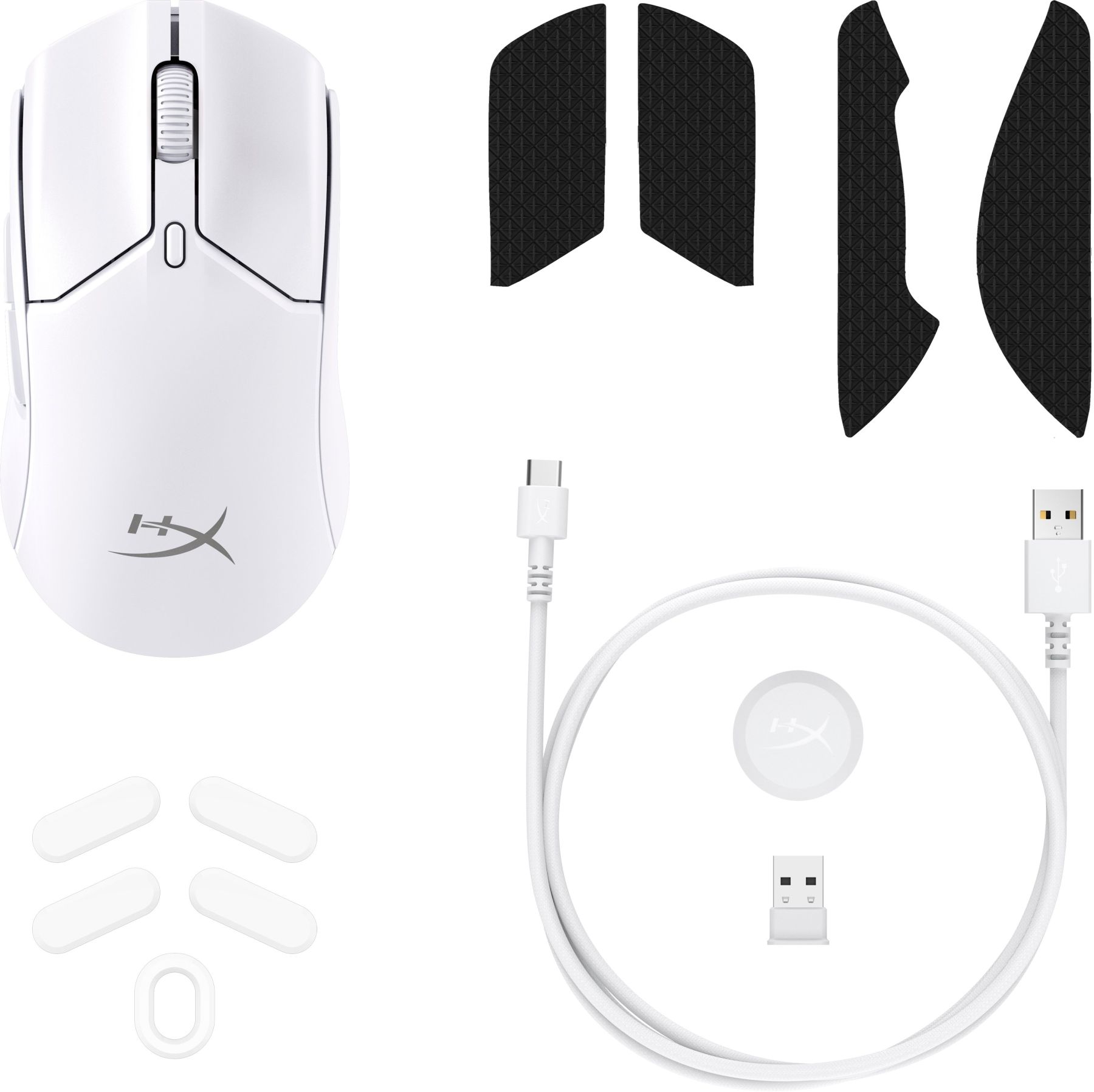 Комплектація:Бездротова гарнітура HyperX Pulsefire Haste 2 Mini, Маніпулятори HyperX, Ролики з низьким коефіцієнтом тертя, Кабель USB-C до USB-A, Бездротовий USB-ключ, USB-подовжувач, Короткий посібник користувача