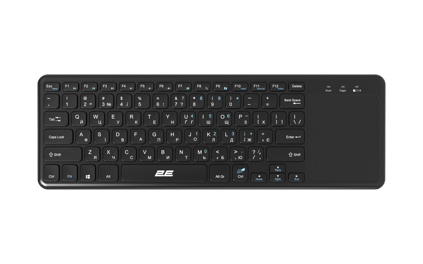 2E KT100 розроблено спеціально для зручної роботи. З її допомогою можна замінити відразу два пристрої і працювати в зручному для себе місці. Підтримуються різні ОС, в тому числі і SmartTV, тому один з сценаріїв передбачає роботу з телевізором прямо на дивані. Клавіатура виконана з чорного полікарбонату з матовою поверхнею. Тачпад отримав приємне покриття, завдяки якому палець відмінно ковзає по поверхні. Вся лінійка клавіатур 2Е має пріоритетну українську розкладку.