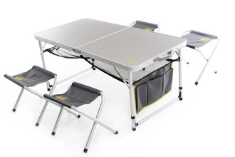 Стіл-валіза легко складається, що дозволяє заощадити простір при транспортуванні та зберіганні. Крісла також складні, що робить набір зручним для перенесення. Конструкція столу та стільців виготовлена із міцних матеріалів, таких як алюміній та сталь, що гарантує тривалий термін служби та стійкість до впливу погодних умов. Набір включає стіл з додатковою полицею для розміщення страв, напоїв та інших предметів. Це дозволяє заощадити простір на столі і упорядкувати речі під час пікніка.